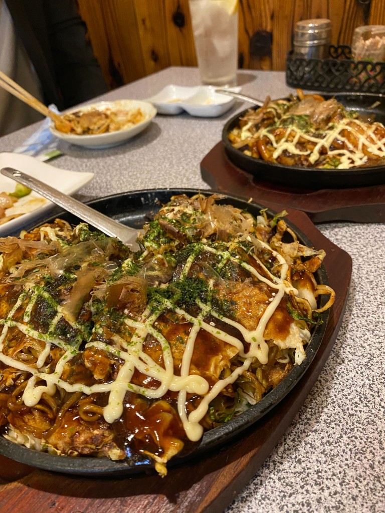 手前からミックス玉もだん焼きと、奥に見えているのが肉玉にキムチをトッピングしたもだん焼き(うどんver)です。