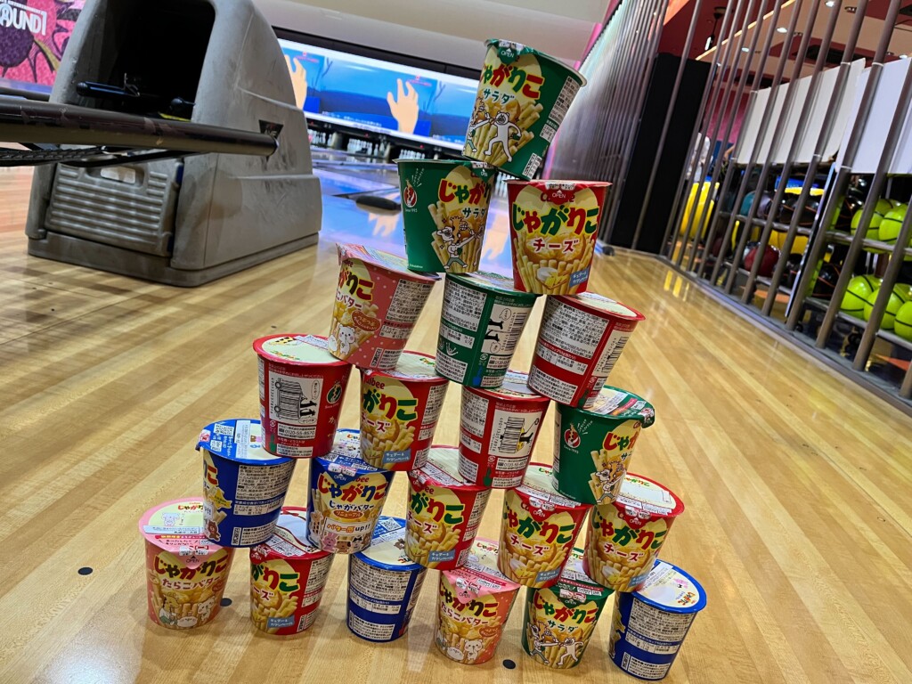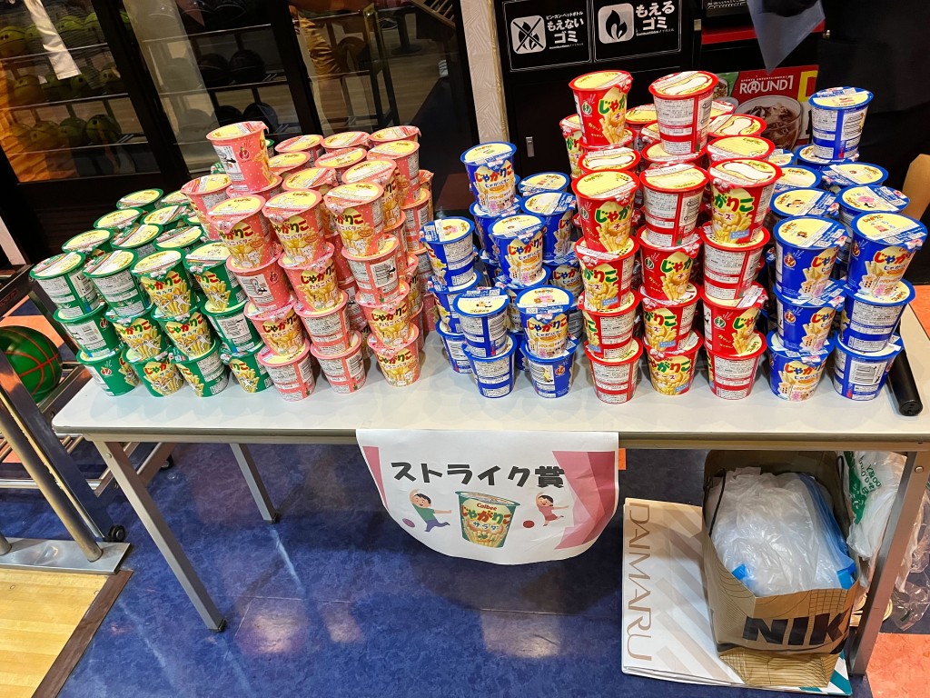 そして、順位とは別に「ストライク賞」があり、男性はストライク、女性はストライクもしくはスペアを取ることができれば、じゃがりこが1ついただけます。(先着順)