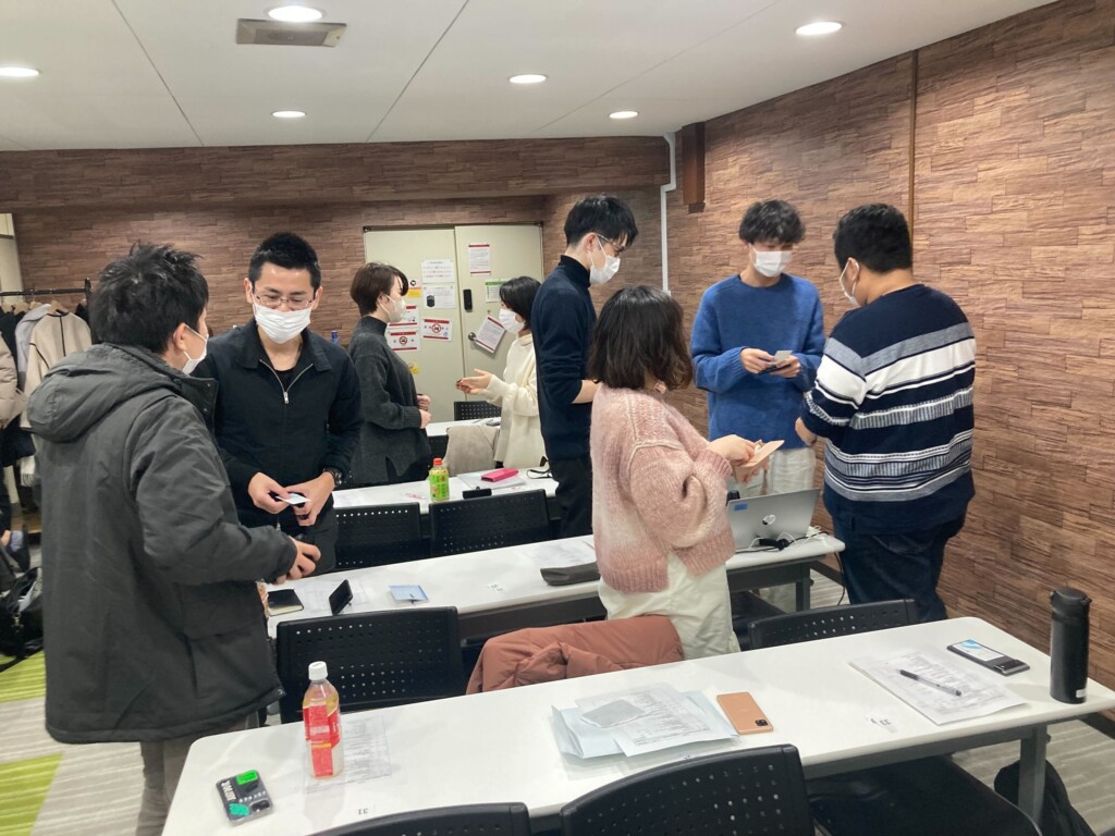 実践を含めた詳しい説明を受け、近くの席の方と実際に名刺交換の練習をしました。