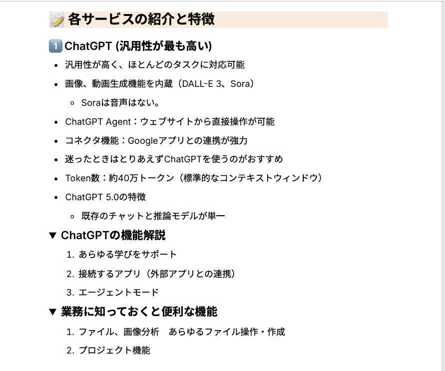 これらのサービスは、文章作成や情報整理、アイデア出しなど、多岐にわたる業務をサポートしてくれる頼もしい存在です。