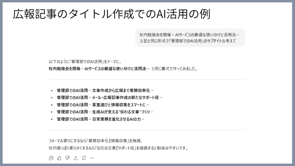 記事の構成、言い回しの改善、タイトル案の提示など、AIからアイデアを得ることがあります。