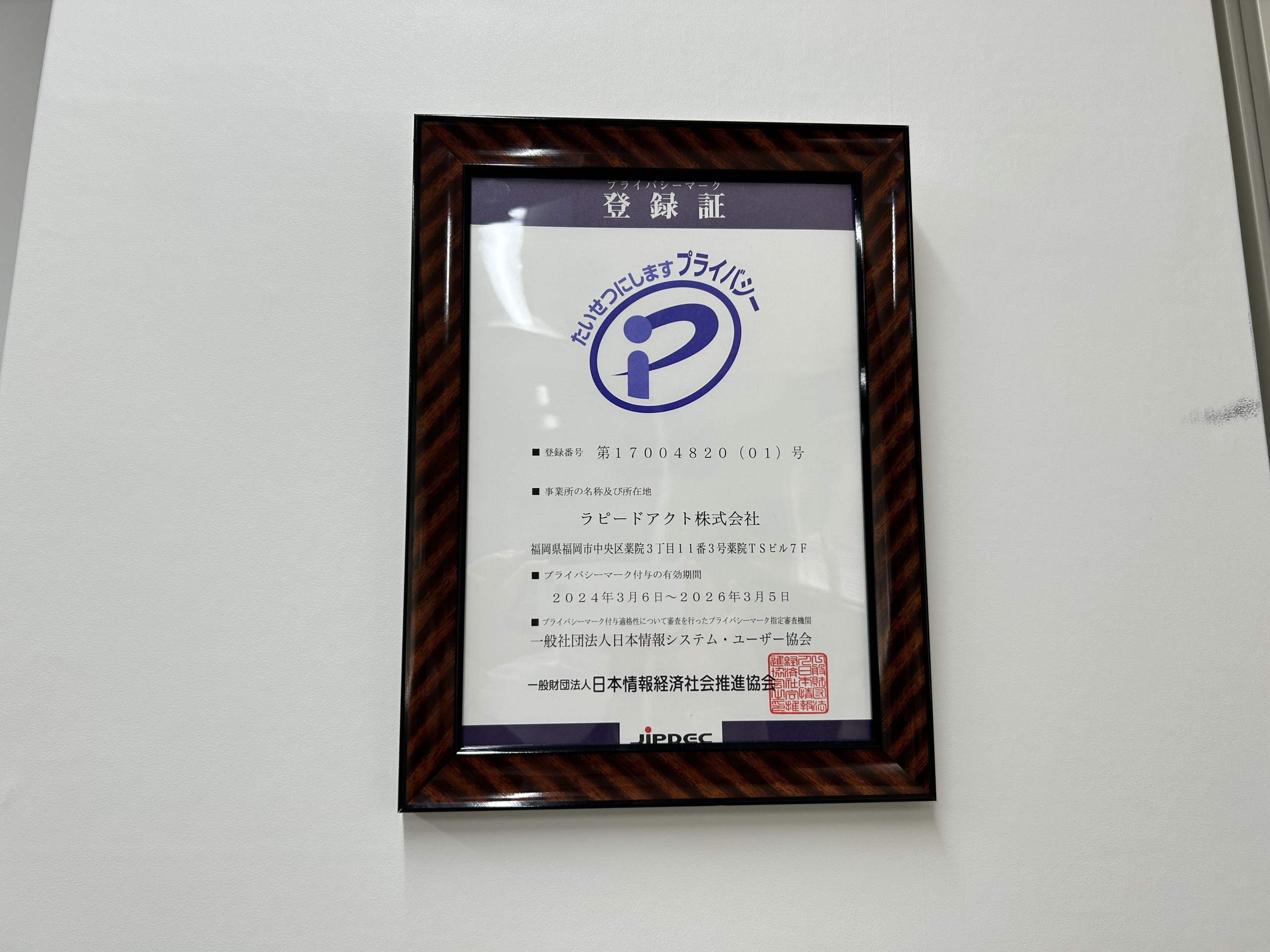一般財団法人 日本情報経済社会推進協会(JIPDEC)から「プライバシーマーク(Pマーク)」を認定取得いたしました。